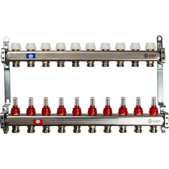 Коллекторы торговой марки STOUT распределительные с шаровыми и регулировочными клапанами для систем отопление и водоснабжения предназначены для распределения потока транспортируемой среды по потребителям, перекрытия и регулировки отводов. Коллекторные системы могут использоваться на трубопроводах систем холодного и горячего водоснабжения, отопления, а также для транспортировки жидкости не агрессивной к материалам элементов коллекторных систем. Распределительные коллекторы с регулировочно-запорными клапанами имеют возможность соединения между собой по принципу модульности.