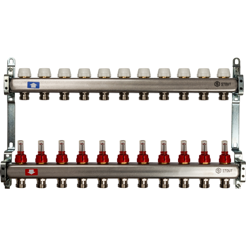 Коллекторная группа для теплых полов 11 выходов (полный комплект(краны, термометры, воздухоотводчики, сливники) 1*3/4 с расходомерами нержавейка STOUT