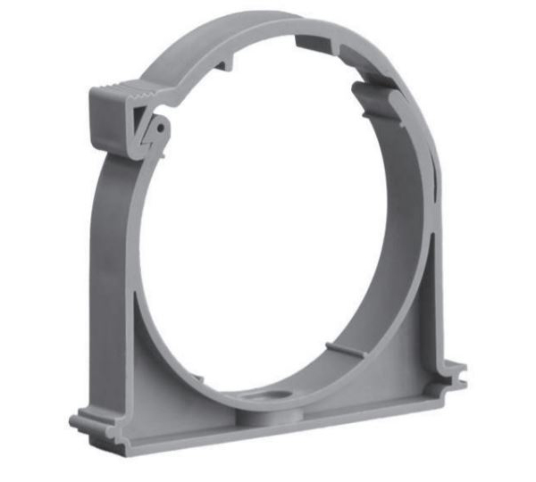 Хомут используется для фиксации элементов внутренней канализационной системы, выпускается диаметром 110 мм. Расстояние между хомутами должно составлять: для горизонтальных линий - 10 диаметров прокладываемой трубы, для вертикальных линий (для стояков) - 1000 - 2000 мм. Материал хомута - полипропилен.