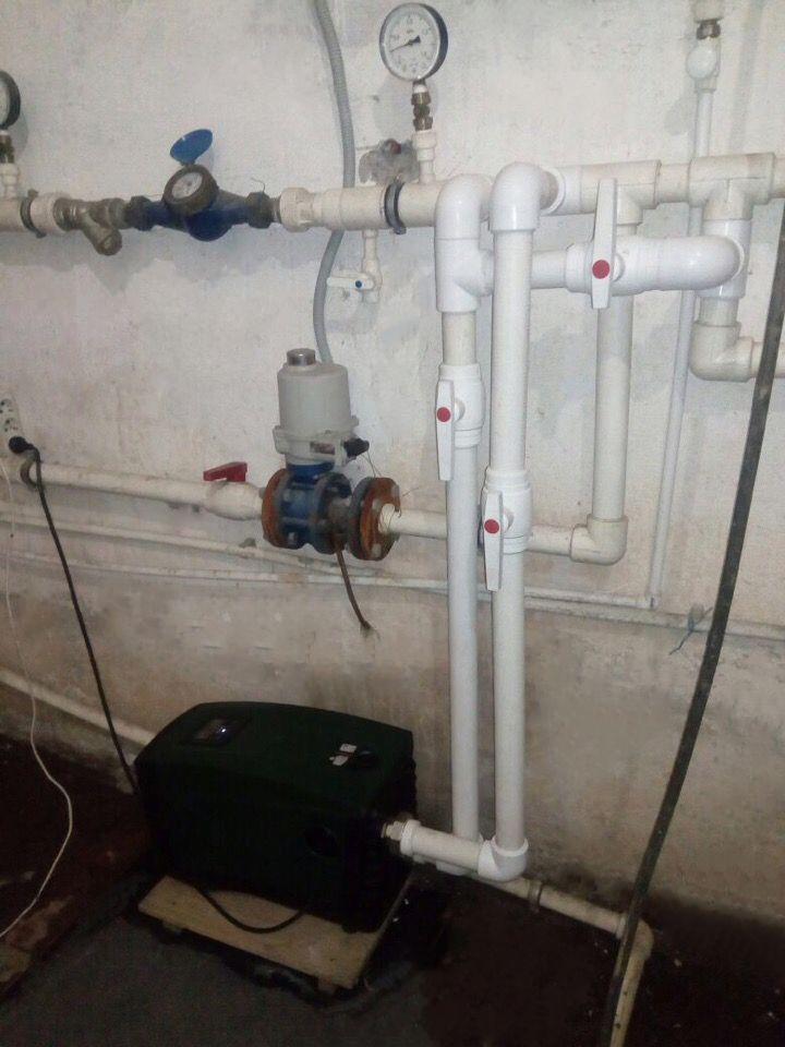 подключили насос к трубе водоканала и вывели его на всю общую систему. В итоге напор не падает при